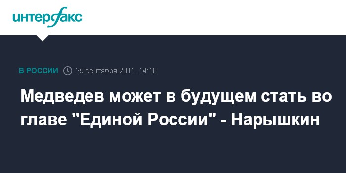 Москва. 25 сентября. INTERFAX.RU - Нынешний президент России Дмитрий Медведев может в дальнейшем возглавить партию "Единая Россия", считает руководитель кремлевской администрации Сергей Нарышкин. "Осмелюсь предположить, что после победы на парламентских и президентских выборах, после соответствующих процедур Дмитрий Анатольевич Медведев может возглавить партию "Единая Россия", - заявил С.Нарышкин, выступая в воскресенье на медиа-форуме ОНФ и "Единой России".