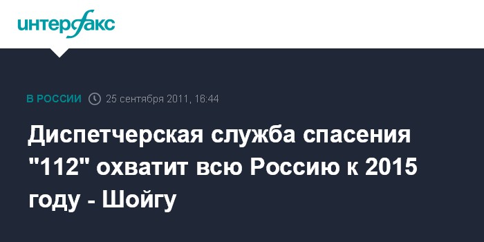 Москва. 25 сентября. INTERFAX.RU - До 2015 года по всей территории России будет действовать служба "112" - диспетчерская служба спасения, сообщил глава МЧС РФ Сергей Шойгу. "К 2015 году такая программа заработает по всей стране", - заявил С.Шойгу, выступая в воскресенье на 6-м общероссийском медиа-форуме партии "Единая Россия".