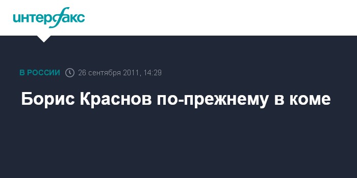 Москва. 26 сентября. INTERFAX.RU - Известный художник-декоратор Борис Краснов, который на прошлой неделе был госпитализирован с инсультом в ФМБЦ имени Бурназяна, по-прежнему находится в коме, сообщил "Интерфаксу" источник в медицинских кругах.