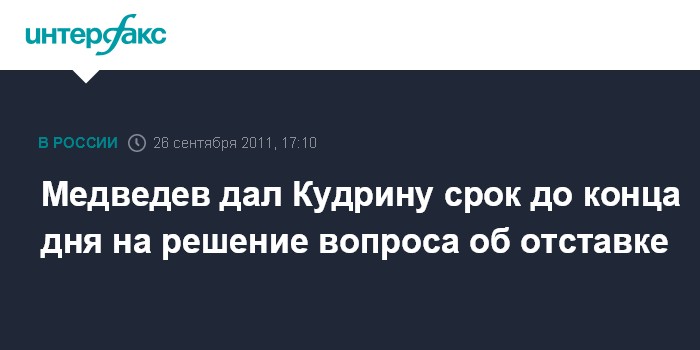 Димитровград. 26 сентября. INTERFAX.RU - Президент РФ Дмитрий Медведев дал вице-премьеру, министру финансов России Алексею Кудрину срок до конца понедельника на решение вопроса о его отставке.