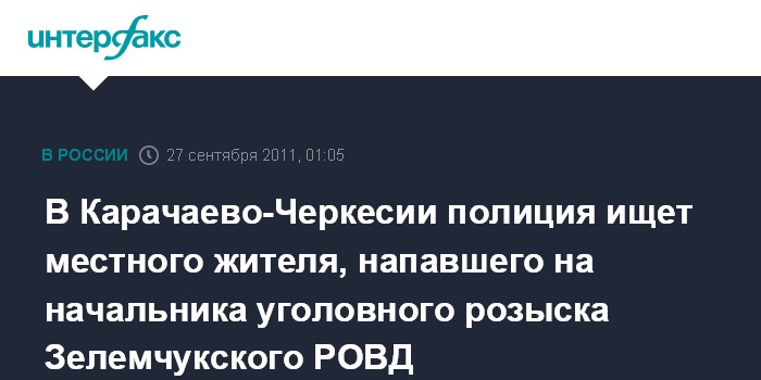Ростов-на-Дону. 27 сентября. ИНТЕРФАКС-ЮГ - Полиция ведет поиск жителя Карачаево-Черкесии, напавшего на начальника уголовного розыска Зелемчукского РОВД в момент задержания им водителя "Мерседеса", сбившего скутериста, сообщили агентству "Интерфакс - Юг" в правоохранительных органах КЧР.