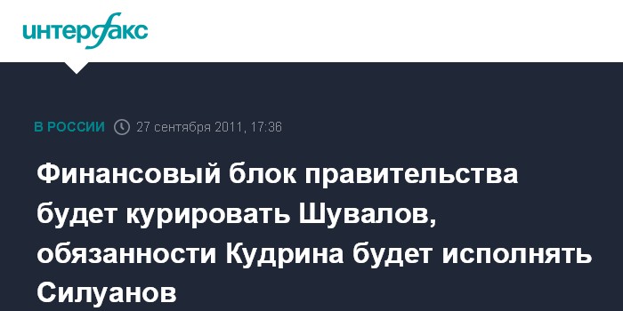 "В связи с отставкой Алексея Леонидовича Кудрина этот блок, финансово-экономический, по линии руководства в правительстве, будет курировать Шувалов Игорь Иванович, обязанности министра (финансов) будет исполнять Антон Германович Силуанов", - заявил Путин, открывая президиум правительства.