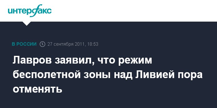 Нью-Йорк. 27 сентября. INTERFAX.RU - Россия выступает за отмену режима бесполетной зоны над Ливией, заявил министр иностранных дел России Сергей Лавров.