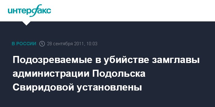 Москва. 28 сентября. INTERFAX.RU - Следственный комитет установил личности подозреваемых в убийстве замглавы администрации Подольска Веры Свиридовой, сообщил официальный представитель СК РФ Владимир Маркин.