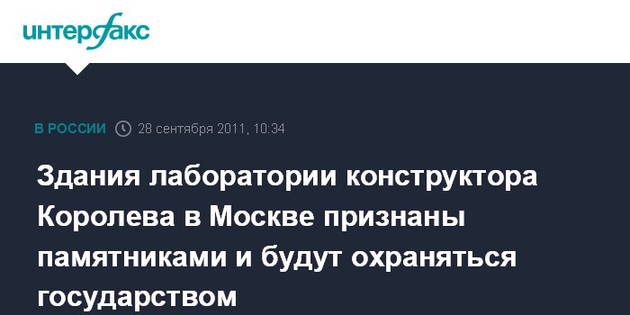 Москва. 28 сентября. INTERFAX.RU - Двум зданиям в центре столицы, где в разное время работала группа изучения реактивного движения (ГИРД) по руководством конструктора Сергея Королева, придан статус объекта культурного наследия, сообщили "Интерфаксу" в пресс-службе Мосгорнаследия в среду.