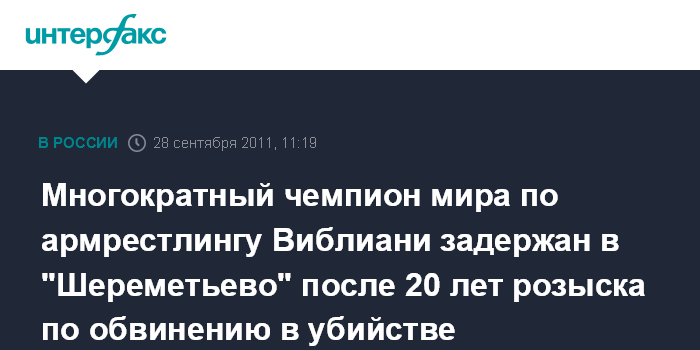 Москва. 28 сентября. INTERFAX.RU - 12-кратный чемпион мира по армрестлингу Джамбул Виблиани, находившийся более 20 лет в международном розыске по обвинению в убийстве, задержан в аэропорту "Шереметьево", сообщили в пресс-службе Главного управления уголовного розыска (ГУУР) МВД РФ.