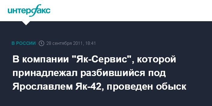 Москва. 28 сентября. INTERFAX.RU - Следователи СК РФ провели обыск в авиакомпании "Як-Сервис", которой принадлежал Як-42, потерпевший 7 сентября катастрофу под Ярославлем, сообщил официальный представитель СК РФ Владимир Маркин.