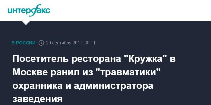 Москва. 29 сентября. INTERFAX.RU - В Москве в ресторане "Кружка" на улице Лескова в ночь на четверг произошел конфликт между клиентом и администрацией, который закончился стрельбой из травматического пистолета.