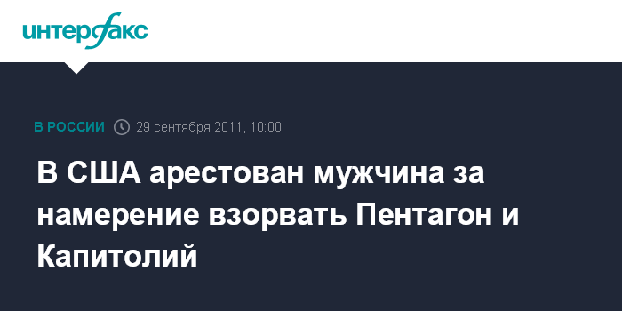Вашингтон. 29 сентября. INTERFAX.RU - Власти США арестовали 26-летнего мужчину, планировавшего использовать начиненный взрывчаткой радиоуправляемый самолет для атак на Пентагон и здание конгресса на Капитолийском холме в Вашингтоне, сообщает в четверг телеканал CNN.