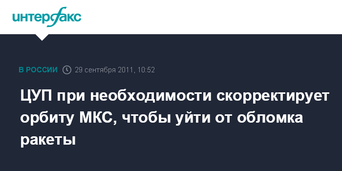 Москва. 29 сентября. INTERFAX.RU - Специалисты российского Центра управления полетами прорабатывают возможность коррекции орбиты Международной космической станции в связи с тем, что ей угрожает опасное сближение с обломком ракеты-носителя "Циклон-3", сообщили "Интерфаксу-АВН" в четверг в пресс-службе Роскосмоса.