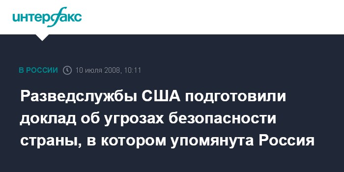 Москва. 10 июля. INTERFAX.RU - В США впервые обнародован полный текст доклада об угрозах безопасности Соединенных Штатов, который разведывательные службы этой страны ежегодно предоставляют в комитет сената по военной службе.