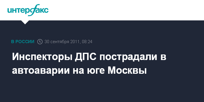Москва. 30 сентября. INTERFAX.RU - Два автоинспектора пострадали в ДТП на юге Москвы, сообщил "Интерфаксу" в пятницу источник в правоохранительных органах.
