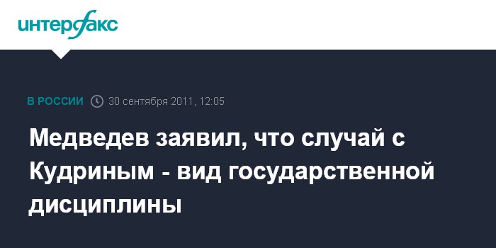 Москва. 30 сентября. INTERFAX.RU - Президент РФ Дмитрий Медведев заявил, что отставка вице-премьера, министра финансов России Алексея Кудрина - вопрос исключительно государственной дисциплины.