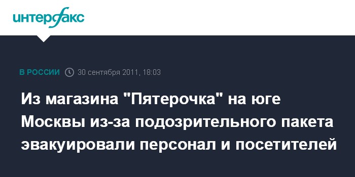 Москва. 30 сентября. INTERFAX.RU - На юге Москвы в связи с возможной угрозой взрыва эвакуирован магазин "Пятерочка".