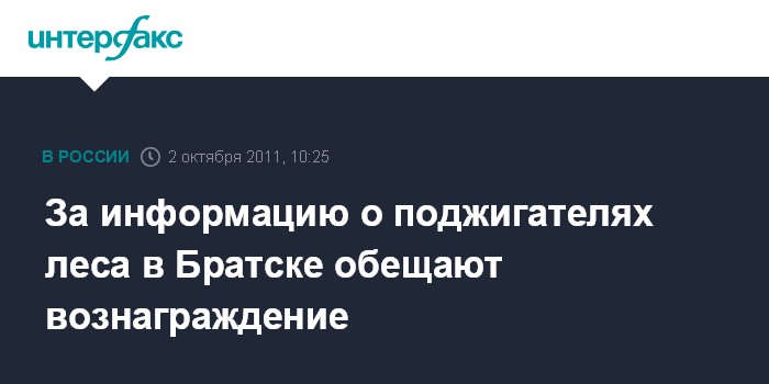 Иркутск. 2 октября. INTERFAX.RU - Вознаграждение в 100 тыс. рублей назначил мэр Братска Константин Климов совместно с полицией за информацию о поджигателях городских лесов, сообщает в воскресенье пресс-служба администрации Братска. "Одной из основных версий возникновения пожаров, по информации полиции, является умышленный поджог. Поэтому сегодня мэром Братска совместно с Управлением МВД принято решение о вознаграждении в сумме 100 тыс. рублей за достоверную и исчерпывающую информацию, которая поможет установить лиц, подозреваемых в совершении умышленных поджогов", - говорится в сообщении.