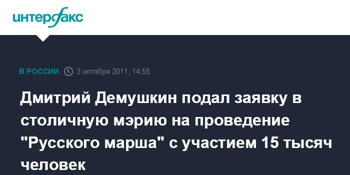 Москва. 3 октября. INTERFAX.RU - Националисты подали заявку в мэрию Москвы на проведение многотысячного шествия и митинга 4 ноября - в День народного единства, сообщил организатор акции Дмитрий Демушкин.