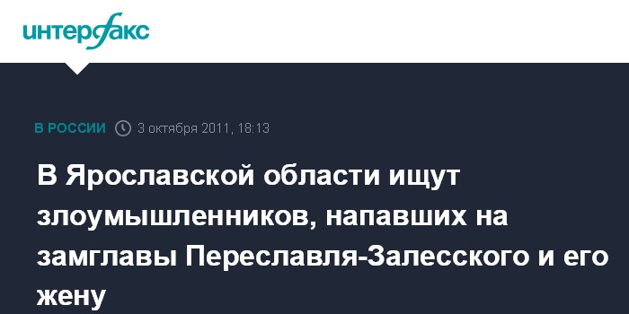Ярославль. 3 октября. INTERFAX.RU - В Переславле-Залесском (Ярославская область) в понедельник совершено нападение на заместителя главы города Николая Ковалева и его жену, сообщили "Интерфаксу" в УМВД по Ярославской области.
