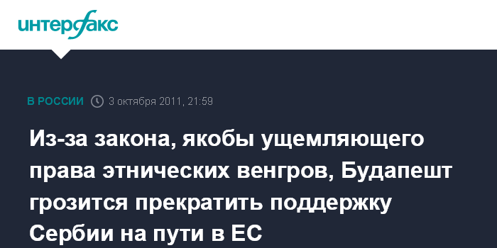 "Мы более чем привержены европейской интеграции Сербии, но вступление не видится нам реалистичным в свете принятия законов, ограничивающих гражданские права (венгров в Сербии - ИФ)", - заявил венгерский вице-премьер Жолт Семен во время визита в сербский город Суботицу - центр автономного края Воеводины, где проживает значительное количество этнических венгров.