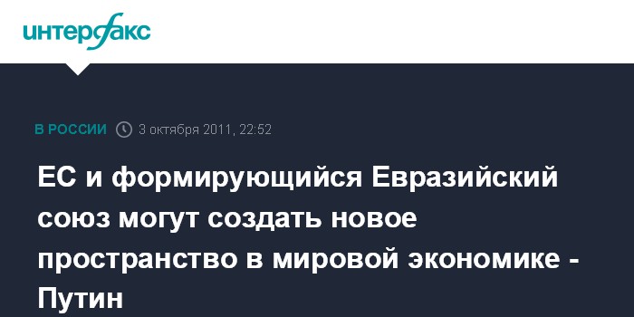 "К примеру, два крупнейших объединения нашего континента - Евросоюз и формирующийся Евразийский союз - основывая свое взаимодействие на правилах свободной торговли и совместимости систем регулирования, объективно, в том числе и через отношения с третьими странами и региональными структурами, способны распространить эти принципы на все пространство - от Атлантики до Тихого океана", - пишет В.Путин.