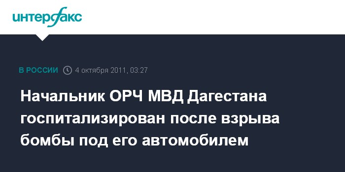 Ростов-на-Дону. 4 октября. ИНТЕРФАКС-ЮГ - В Дагестане взрывное устройство сработало под автомобилем "ВАЗ-2110", в котором утром в понедельник ехал на службу начальник оперативно-розыскной части (ОРЧ) МВД республики, сообщили агентству "Интерфакс-Юг" в правоохранительных органах региона.