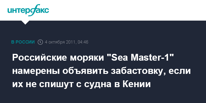 Владивосток. 4 октября. ИНТЕРФАКС - ДАЛЬНИЙ ВОСТОК - Семь российских моряков - экипаж судна "Sea Master-1" в Судане заявили судовладельцу, что намерены объявить забастовку, если их не спишут с судна в следующем порту, так как они не желают работать в опасном районе, кишащем пиратами.