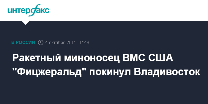 Владивосток. 4 октября. ИНТЕРФАКС - ДАЛЬНИЙ ВОСТОК - Ракетный эскадренный миноносец ВМС США "Фицжеральд" во вторник завершил деловой визит и покинул главную базу Тихоокеанского флота (ТОФ) порт Владивосток.
