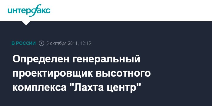 Санкт-Петербург. 5 октября. INTERFAX.RU - В Петербурге определились с подрядчиком, который разработает проектную документацию высотного делового комплекса "Лахта центра", сообщает в среду пресс-служба ЗАО "Общественно-деловой центр "Охта".