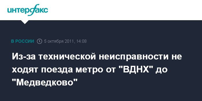 Москва.5 октября. INTERFAX.RU - Техническая неисправность в московском метрополитене привела к тому, что с 13:23 среды по Калужско-Рижской линии не ходят поезда от станции "ВДНХ" до "Медведково".