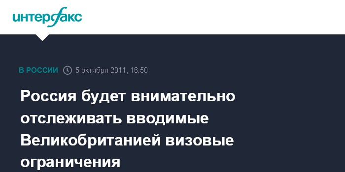 Москва. 5 октября. INTERFAX.RU - Россия намерена следить за действиями британской стороны по вопросу возможных ограничений на выдачу виз российским гражданам, напоминает о существующем в международной практике принципе взаимности в отношениях между странами, заявили в МИД РФ в среду.