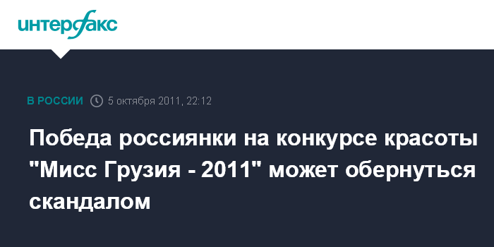 Тбилиси. 5 октября. INTERFAX.RU - Результаты конкурса "Мисс Грузия - 2011", финальная часть которого состоялась 1 октября в Батуми, могут быть поставлены под сомнение, поскольку, как сообщила грузинская телекомпания "Рустави-2", победительницей оказалась гражданка России.