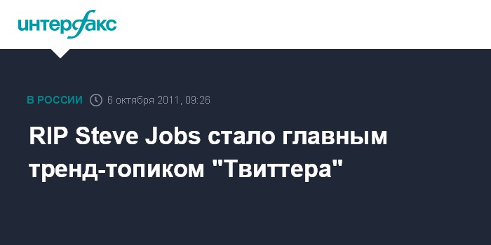 Москва. 6 октября. INTERFAX.RU – В четверг ведущим трендом сети микроблогов Twitter стало обсуждение смерти сооснователя компании Apple Стива Джобса. Топик RIP Steve Jobs занял первое место в списке популярных тем.