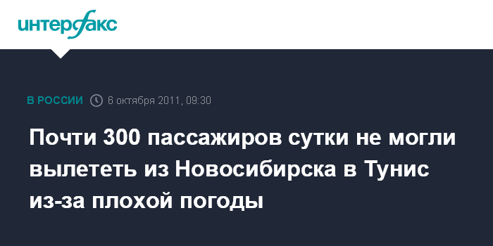 Новосибирск. 6 октября. INTERFAX.RU - Почти 300 пассажиров рейса Новосибирск-Монастир (Тунис) авиакомпании "Северный ветер" сутки прождали отправки из аэропорта "Толмачево", сообщает в четверг старший помощник Западно-Сибирского транспортного прокурора Наталья Криницкая.