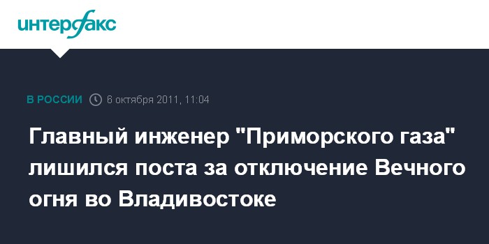 Владивосток. 6 октября. INTERFAX.RU - Главный инженер ОАО "Приморский газ" Александр Бурнаевский и начальник отдела по обслуживанию памятников Владивостокского филиала ОАО "Славянка" Анатолий Зубараев лишились своих постов за отключение газоснабжения Вечного огня.