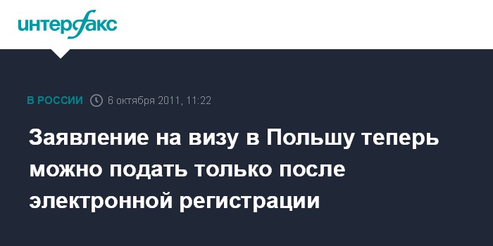 Москва. 6 октября. INTERFAX.RU - Визовые анкеты на оформление визы во всех польских консульских учреждениях в России с 15 сентября 2011 года принимаются только после предварительной электронной регистрации, сообщает со ссылкой на посольство Польши в РФ Федеральное агентство по туризму (Ростуризм).
