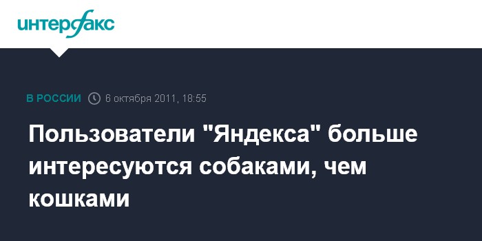 Москва. 6 октября. INTERFAX.RU – Вопросы, связанные с собаками, задаются поисковику "Яндекса" значительно чаще, чем вопросы о кошках.
