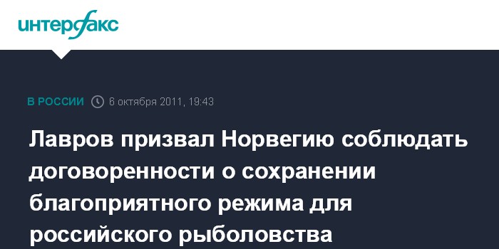 "Российской стороной обозначена серьезная озабоченность участившимися случаями задержаний наших рыболовных судов в т.н. "рыбоохранной зоне" вокруг архипелага Шпицберген. Подчеркнуто, что это не соответствует достигнутым договоренностям о сохранении благоприятного режима для российского рыболовства в условиях разграничения морских пространств между Россией и Норвегией", - сказал С.Лавров, высказывания которого приводит в пятницу МИД России.