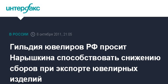 Москва. 6 октября. INTERFAX.RU - Ассоциация "Гильдия ювелиров России" обратилась к главе администрации президента РФ Сергею Нарышкину с просьбой способствовать изменению ставок таможенных сборов за оформление экспорта ювелирных изделий. Письмо гендиректора Гильдии ювелиров Владимира Моспана размещено на сайте этой организации.