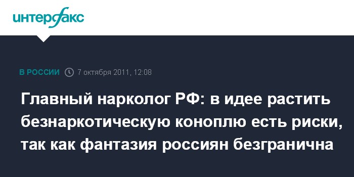 "Фантазия нашего народа безгранична. Может быть все, что угодно. Гарантий, что в недрах ненаркотической конопли не будут выращивать наркотическую коноплю, никто не даст", - сказал главный нарколог Минздравсоцразвития РФ.