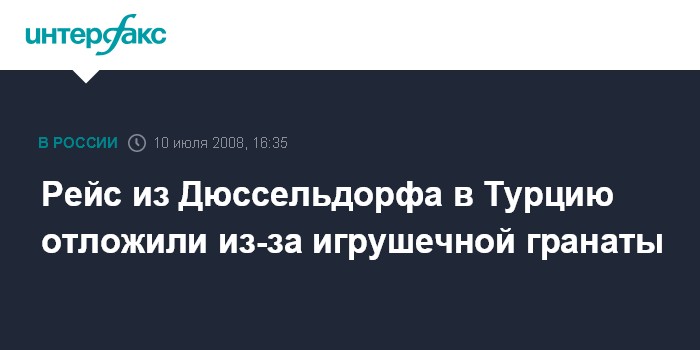 Москва. 10 июля. INTERFAX.RU - Авиарейс из Дюссельдорфа в Турцию был задержан на три часа после того, как в багаже 23-летнего турецкого гражданина, летевшего из Нью-Йорка, была обнаружена ручная граната. Позже выяснилось, что это муляж.