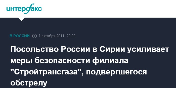 Посольство России в Сирии усиливает меры безопасности филиала "Стройтрансгаза", подвергшегося обстрелу