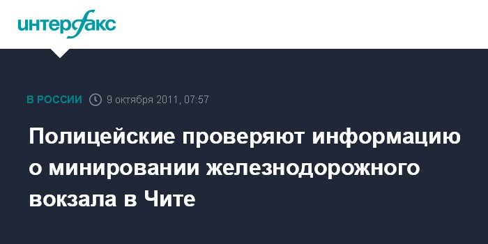 Чита. 9 октября. ИНТЕРФАКС-СИБИРЬ - Транспортная полиция Читы проверяет информацию о минировании железнодорожного вокзала, поступившую по телефону оперативному дежурному.