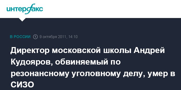 Москва.9 октября. INTERFAX.RU - Андрей Кудояров, директор школы номер 1308, арестованный в ноябре по обвинению в получении взятки, скончался в следственном изоляторе номер 3 в Силикатном проезде на северо-западе Москвы, сообщил "Интерфаксу" в воскресенье высокопоставленный источник в правоохранительных органах.