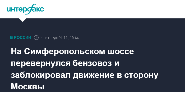 Москва.9 октября. INTERFAX.RU - Перевернувшийся бензовоз осложнил движение на Симферопольском шоссе в Подмосковье, передает корреспондент "Интерфакса".