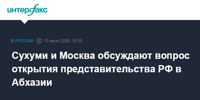 "Такой вопрос не обсуждался, он находится в работе, это будет не диппредставительство. Если будет, так это будет ассоциация отношений по землячеству, по согражданам, по гражданам Российской Федерации. Этот вопрос гибкий, и сегодня он не обсуждался", - сказал Багапш журналистам по итогам встречи с главой МИД РФ Сергеем Лавровым.