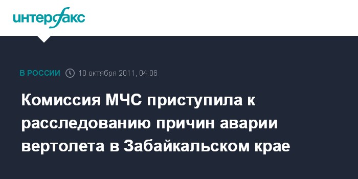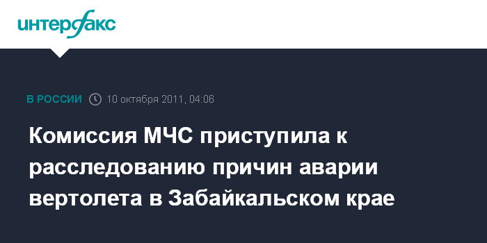 Чита. 10 октября. ИНТЕРФАКС-СИБИРЬ - Комиссия МЧС под руководством начальника авиации МЧС Сергея Федорова прибыла в Читу для выяснения причин аварийной посадки вертолета Ми-8 в Кыринском районе.