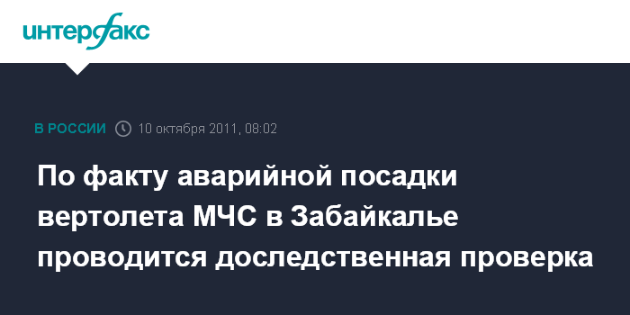 Чита. 10 октября. INTERFAX.RU - Восточно-Сибирское следственное управление на транспорте проводит доследственную проверку по факту аварийной посадки вертолета МЧС Ми-8 в Забайкальском крае, сообщила в понедельник пресс-служба следственного управления.