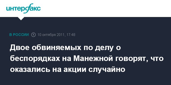 Москва. 10 октября. INTERFAX.RU - Двое фигурантов дела о беспорядках на Манежной площади в декабре прошлого года заявляют в суде, что не планировали участвовать в массовых акциях.