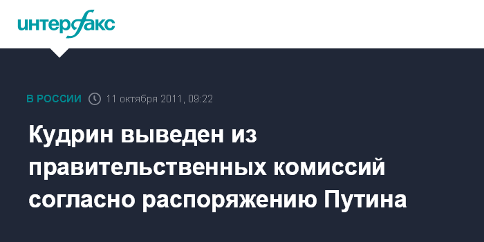 Согласно распоряжению премьер-министра Владимира Путина от 5 октября, Кудрин выведен из состава правительственной комиссии по бюджетным проектировкам на очередной финансовый год и плановый период, Военно-промышленной комиссии при правительстве, правительственной комиссии по вопросам регионального развития, межведомственной рабочей группы по модернизации и инновационному развитию ОПК, правительственной комиссии по экономическому развитию и интеграции, правительственной комиссии по высоким технологиям и инновациям, рабочей группы по реализации программы правительства по повышению эффективности бюджетных расходов, а также из оргкомитета по подготовке и проведению Красноярского экономического форума и набсовета оргкомитета "Россия - 2018".