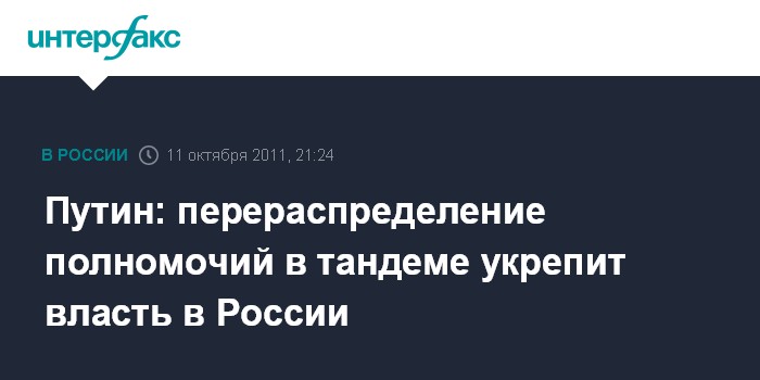 Пекин. 11 октября. INTERFAX.RU - Премьер-министр РФ Владимир Путин уверен, что идеи "тандема" по перераспределению властных полномочий укрепят систему управления страной, и рассчитывает на поддержку избирателей.