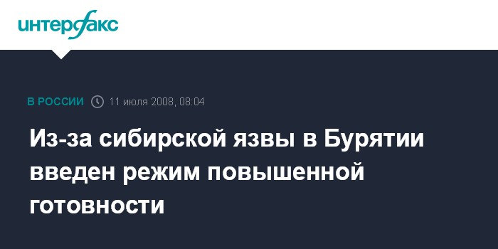 Москва. 11 июля. INTERFAX.RU - В Баргузинском районе Республики Бурятия продолжается падеж скота; уже восемь человек госпитализированы с сибирской язвой и еще трое находятся в больнице на обследовании.